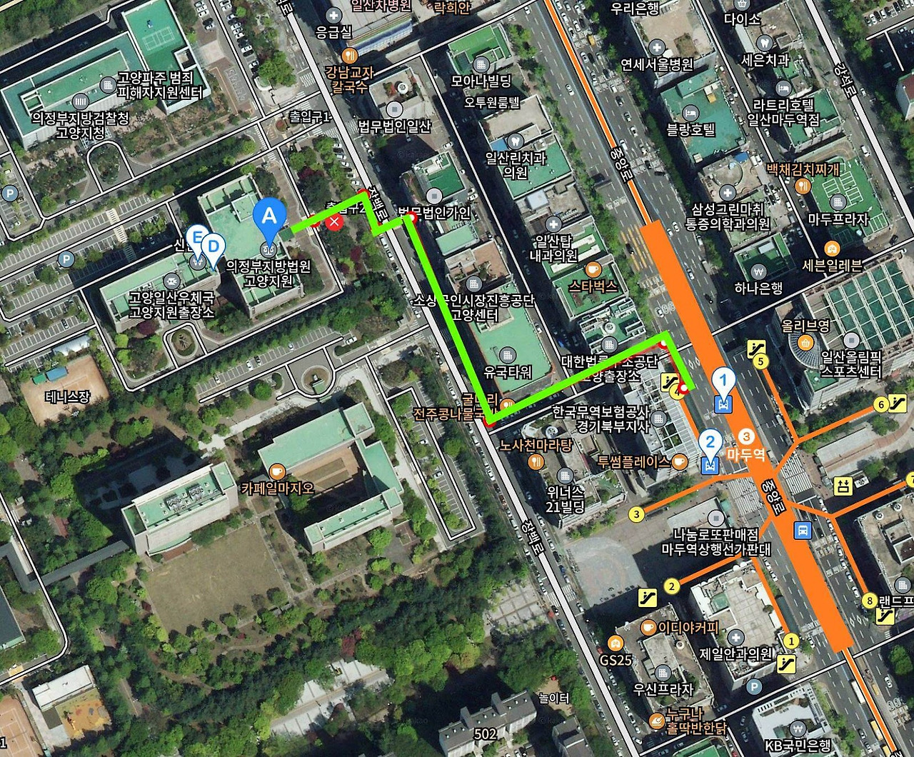 3호선 마두역에서 내려서 ‘의정부지방법원 고양지원’ 정문까지 가는 방법입니다.